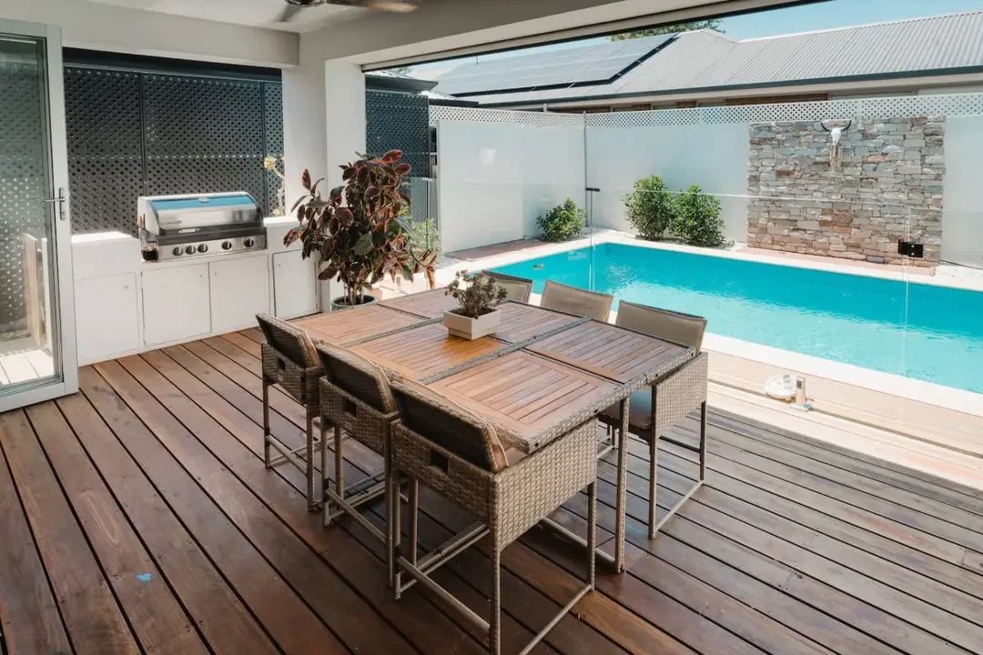 Outside, guests can enjoy the private pool and outdoor dining area, creating the perfect setting for warm Adelaide evenings.